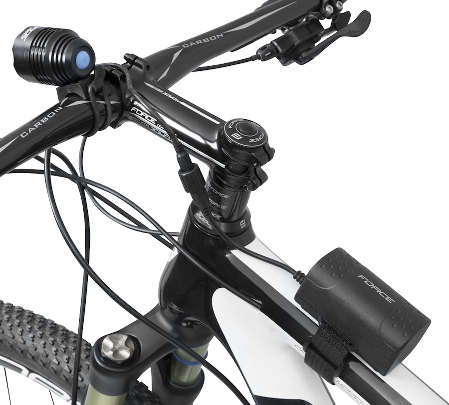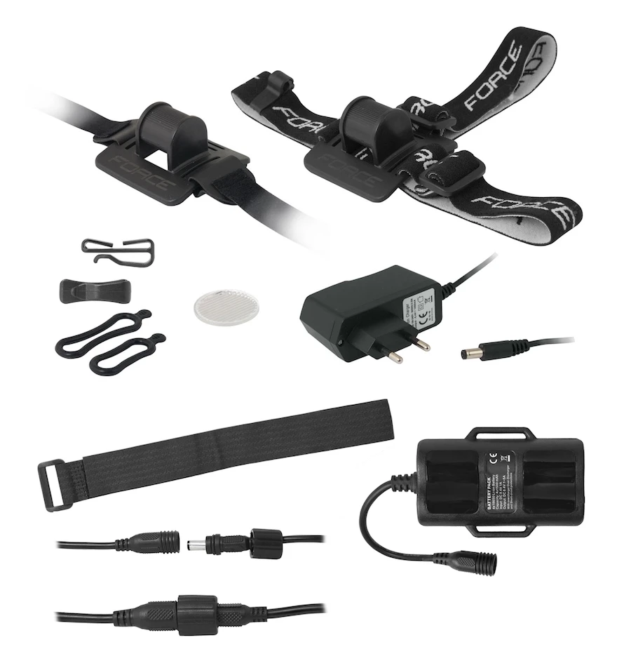 The package includes a flashlight, a battery, 2 rubber lugs to hold the light, a helmet holder, a handle for use as a headlamp, a replacement widescreen lens,extension cable 110 cm.