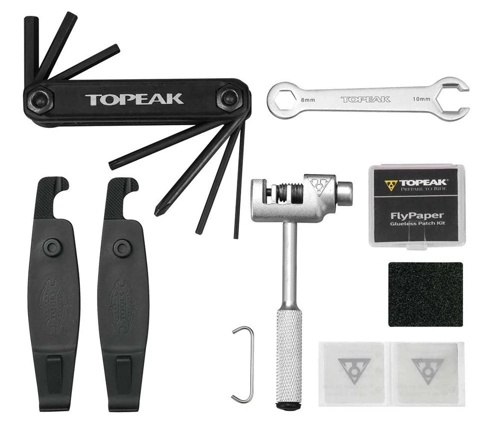 • tool set with 13 functions Contains 2, 3, 4, 5 and 6mm Allen keys, T25 Torx key, Phillips screwdriver, 8 and 10 mm open-end wrenches, chain riveter 2 mounts and a set of self-adhesive patches