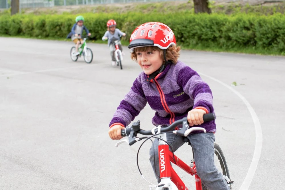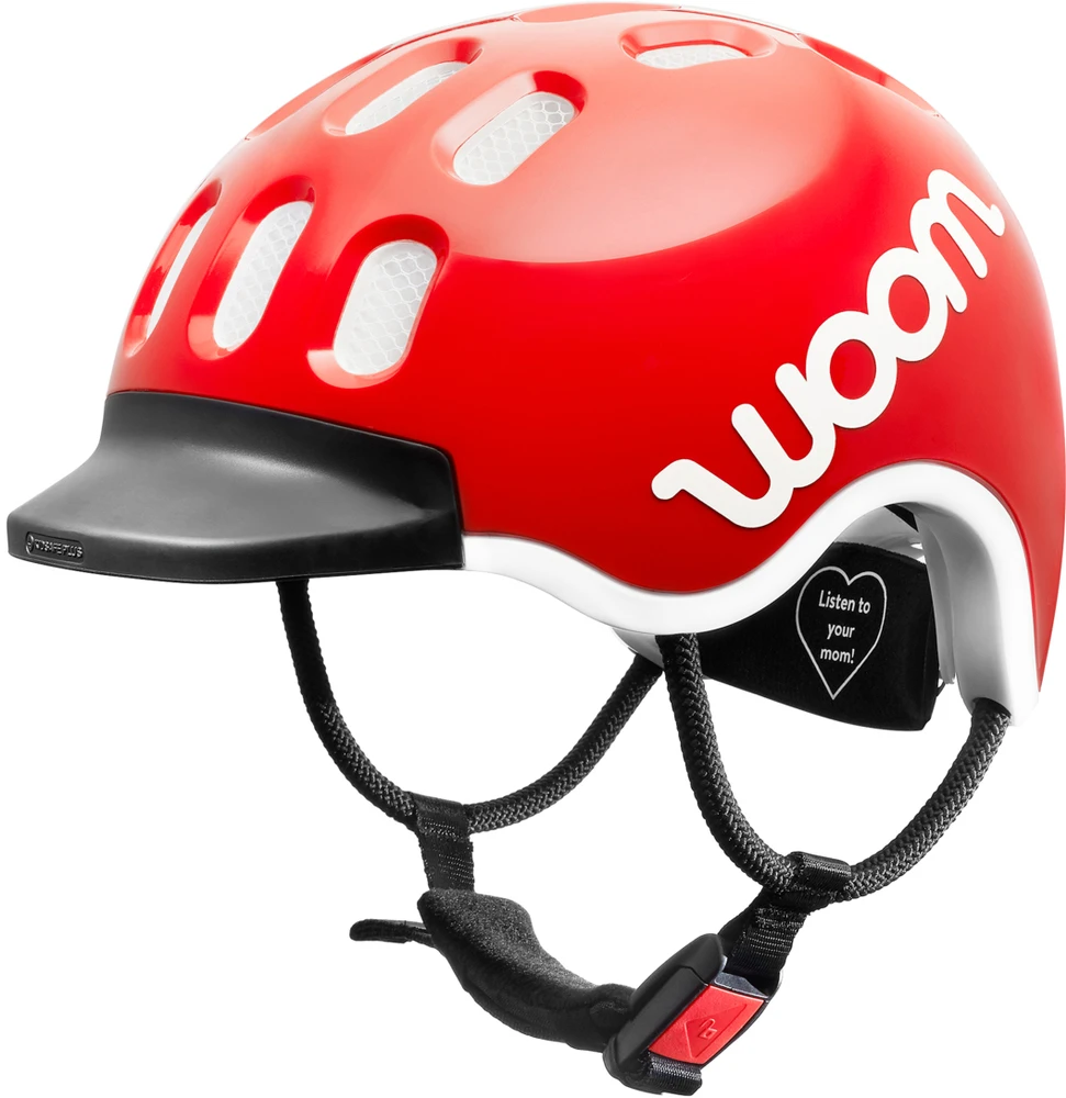 Woom children’s bicycle helmet with extended protection of the back of the head and a magnetic Fidlock buckle.